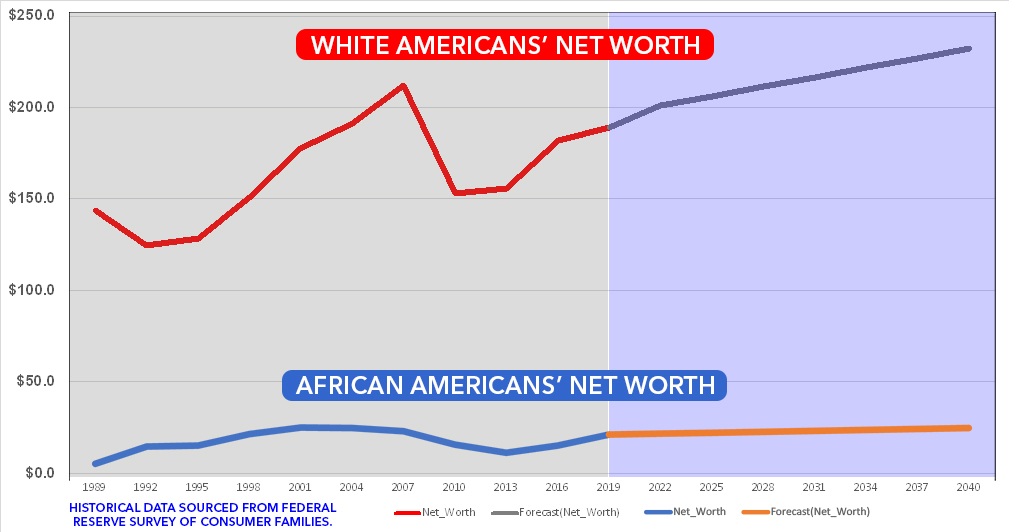 Let’s run with that assumption for a moment. I downloaded historical consumer household data from the US Federal Reserve Bank, and then performed a quick-and-dirty regression analysis to forecast net worth by race 19 years from now.