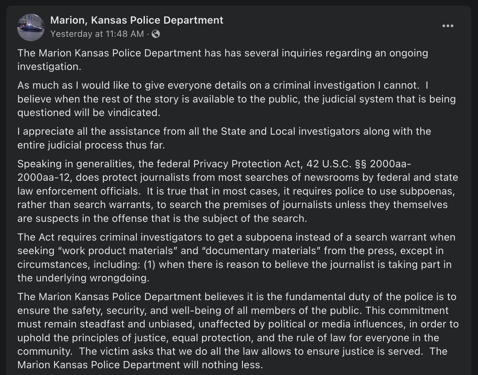The Marion Police Department believes they found a loophole in First Amendment protections and posted their thoughts on Facebook. They end their statement with “The victim asks that we do all the law allows to ensure justice is served. The Marion Kansas Police Department will nothing less.”